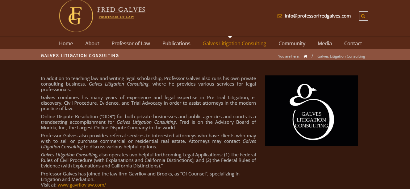 Professor Fred Galves, Harvard Law School alum and former Pacific McGeorge School of Law professor, was in need of a website reflecting his diverse expertise, teaching various law courses, directing a paralegal program, and offering consulting services in Pre-Trial Litigation and Online Dispute Resolution.